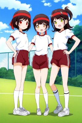 3 cute girls, dark red shorts, gym shorts, {{{{high-waisted gym shorts}}}}, gym uniform, flat chest, brown eyes, nsfw, red headband, white headband, stand side by side, stand at ease, {{white socks}}, white shoes, sports shoes, schoolyard, clear sky, anime drawings, anime coloring, best quality, amazing quality, very aesthetic, absurdres