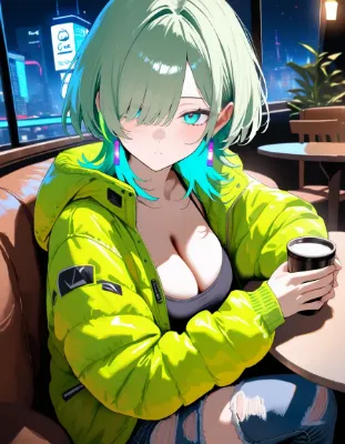 masterpiece, best quality, extremely detailed, 2000s animation, from above, 1girl, solo, kwaii, 17yo, petite, small breasts, squatting, paw pose, white blouse, light green vest, ribbon with bell, green plaids skirt, white frilled skirt, green stripe thighhighs, beautiful detailed face and eyes, expressionless, (head tilt:1.5), brown long hair, hair intakes, ahoge, hair between eyes, green eyes, brown cat ears, fang, brown cat tail, messy room