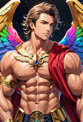 masterpiece, best quality, extremely detailed, anime, 1 male, male focus, solo, male face, male eyes, adam’s apple,larynx, sharp nose, facial muscle, Muscular Physique, Chiseled Abs, Powerful Biceps, Sculpted Chest, V-Shaped Torso, Bulging Muscles, Ripped Physique, ,,, rainbow colored wings, golden sword in right hand, scales in left hand, red cloak, golden full body armor,,,,
