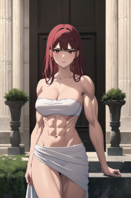 wavy red middle hair,tall lady,(weed wrapped around her body),bare belly,bare arm ,bare shoulder,bare neck,bare thighs,strapless,large breasts,muscles,muscular arms,muscular thigh,strong lady, in ancient Greece,an extremely delicate and beautiful, fury face,arm behind hip,upper body <lora:flat1:-0.35> <lora:eyecolle_platanus_v100:1>,