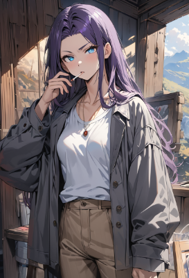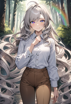masterpiece, best quality, extremely detailed, high resolution, 8k, 16k, cowboy shot , ((no hat:1.3)), Japanese anime, beautiful face, 1girl, silver hair, (super long hair:1.3), (swept bangs:1.2), (ahoge:1.3), ((wave hair:1.4)), BREAK((rainbow eyes:1.3)), (tsurime), (beautiful detailed eyes:1.2), (sharp nose), (close mouth), (light smile), 16 -year-old, 176cm tall, (Muscular), busty, original character, fantasy, (forest background, outdoor cottage:1.3), beautiful fingers, BREAK(brown long pants:1.3), (white collared shirt), BREAK (standing:1.2), shoot from front, looking at viewer