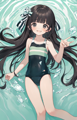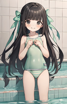 New construction,1 girl,(((very longest hair))),smile, Black hair,flowing hair,straight Hair,hair ribbon,mintgreen stripe,Black Eyes,flat chest,straight Across bangs,princess Cut, Very Long Sideburn,roundry Head,Droping eyes,cute,Meekness,Bob Cut,long back hair,12 years Old,Swimsuits