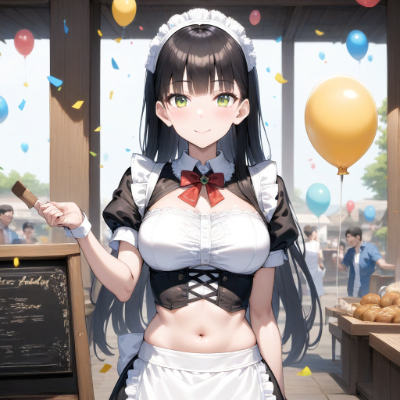 ,,,masterpiece, best quality, extremely detailed, BREAK professional illustration, anime, BREAK, 1girl, black long hair, blunt bangs, large breast, smile, perfect anatomy, BREAK, A baker, a girl with maid cloth in front of navel,midriff,navel cut out , standing in front of a rustic bakery with a wooden sign, surrounded by friends and family, cutting a ribbon, balloons, confetti, warm and inviting atmosphere,{{{ai-generated}}},highres,HDR,{{{official art}}}, , best quality, amazing quality, very aesthetic, absurdres, best quality, amazing quality, very aesthetic, absurdres,