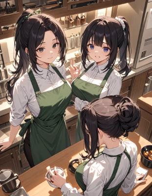 <lora:sdxl_lightning_8_step_lora_f16:1>,, 2girls, standing, dramatic, (focus face:1.5), indoors cafe, kitchen, making coffee, high angle, BREAK expressiveh, perfect lighting, BREAK beautiful lady, 30 years old, ponytail, middle hair, (black hair:1.3), large breasts, white shirt, green apron, smile, happy,
