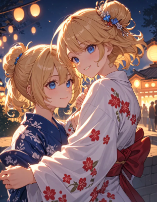 <lora:sdxl_lightning_8_step_lora_f16:1>,, 2Girls , dramatic, (looking back), (focus face:1.5), night, park, festival , BREAK expressiveh, perfect lighting, BREAK seductive smile, 18 years old, girl, short hair, wavy blonde hair , hair ornament, gleaming skin, shiny skin, medium breasts, slender, frosty blue eyes, colorful yukata, BREAK beautiful lady, 30 years old, single bun, (black hair:1.3), large breasts, colorful yukata,
