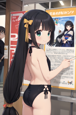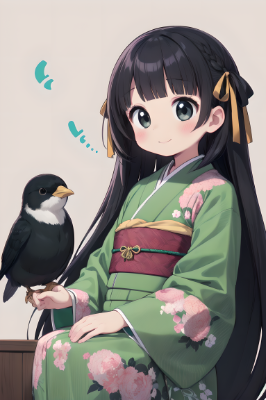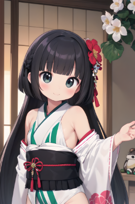 1 girl,(((very longest hair))),black hair, smile,straight Hair,hair ribbon,mintgreen stripe,Black Eyes,flat chest,straight Across bangs,princess Cut, Very Long Sideburn,roundry Head,Droping eyes,cute,Meekness,Bob Cut,long back hair,12 years Old, kimono,swimsuit,flower