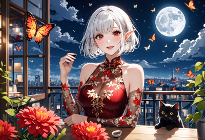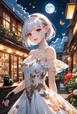 8K,(((masterpiece,best quality,Ultra extremely detailed,perfect anatomy,detailed))),(batterfly_print, see-through transparency gold red flower_print Gorgeous_Cloth_Bodysuit_dress),white hair,(looking at viewer),(((Eye Reflections, detailed_red_eyes))),(opening mouth:1.5),((opened eyes wide)),smile,blush,full fresh lips,big hip,((one beautiful detailed elf)),((strike pose kawaii elf in coffee shop)),solo,elf:2,(bob_cut_hair:1.5),((shining skin)),((shining wear)),((shiny body)),hair band,(white_bob_cut_hair),wave shining white hair,(Shining her face skin),BREAK,butterflies,coffee_shop,moon,many flowers,cloud,building_in_distance,birds,black cat,<lora:hairdetailer:1> <lora:make25d_type1_v100:1>,,,,,,