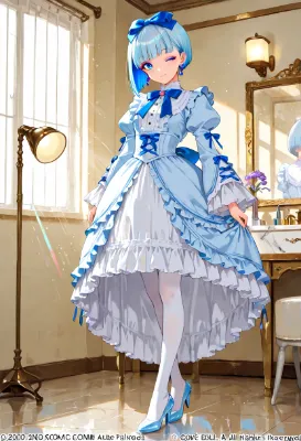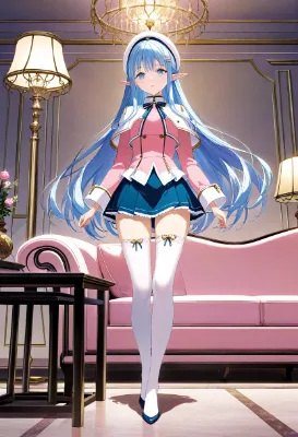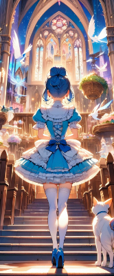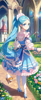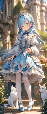 masterpiece, best quality, extremely detailed, anime, girl, skirt,blue hair,blue eyes,princess,light pink color lolita,white stockings,pumps,earrings,Makeup,fantasy,colorful, ,garden,smile,wink,longhair,white cat, <lora:hime_style-1.0r8:1> <lora:noline:1> <lora:sanDka2:1> <lora:hairdetailer:1>,castle