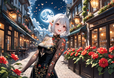 8K,(((masterpiece,best quality,Ultra extremely detailed,perfect anatomy,detailed))),(batterfly_print, see-through transparency gold red flower_print Gorgeous_Cloth_Bodysuit_dress),white hair,(looking at viewer),(((Eye Reflections, detailed_red_eyes))),(opening mouth:1.5),((opened eyes wide)),smile,blush,full fresh lips,big hip,((one beautiful detailed elf)),((strike pose kawaii elf in coffee shop)),solo,elf:2,(bob_cut_hair:1.5),((shining skin)),((shining wear)),((shiny body)),hair band,(white_bob_cut_hair),wave shining white hair,(Shining her face skin),BREAK,butterflies,coffee_shop,moon,many flowers,cloud,building_in_distance,birds,black cat,<lora:hairdetailer:1> <lora:make25d_type1_v100:1>,,,,,,,