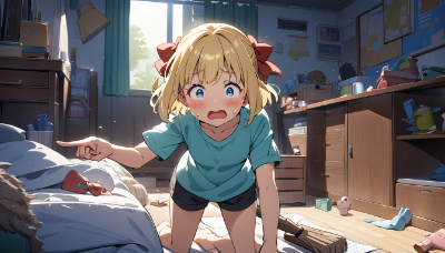 1girl,solo,anime style,(blonde hair:1.2),short hair,blue eyes,hair bow,red bow,young,petite,medium bust,kawaii,(surprised expression:1.3),wide eyes,open mouth,(cleaning room:1.4),(strange object:1.3),indoors,bedroom,messy room,dust particles,(broom:1.2),dustpan,cleaning supplies,standing pose,slightly bent forward,one hand holding broom,other hand pointing at object,full body shot,three-quarter view,casual wear,t-shirt,shorts,bare feet,(hair slightly messy:1.1),sweat drop,raised eyebrows,(blush:1.1),clutter,scattered clothes,books,toys,(mysterious glow:1.2),under bed,partially hidden object,sunlight through window,curtains,posters on wall,desk with papers,(detailed room:1.2),(dynamic lighting:1.1),shadow cast by girl,(focus on face:1.3),(expressive pose:1.2),(masterpiece:1.3),(best quality:1.2),(very aesthetic:1.1),(absurdres:1.2),