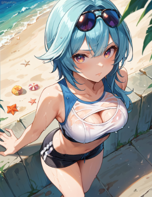 score_9, score_8_up, score_7_up,source_anime, 1girl,(eula_\(genshin_impact\):0.8), looking_at_viewer, standing,from_above, closed_mouth, blush, BREAK, navel,cleavage,bare_shoulders,collarbone, midriff, crop_top, bare_arms,sunglasses,eyewear_on_head, clothing_cutout, cleavage_cutout,white sports bra,wet,black_shorts, short_shorts, BREAK, day,beach,