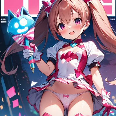 masterpiece,best quality,extremely detailed,(Gravure magazine cover style:1.3),1girl with cute mascot animal,magical_girl,ten years old,infant body type,small_breasts,cute magical_girl_costume,cute_miniskirt,cute_panties,cute_gloves,cute_thigh-boots,cute_head-ornament,cute_smile,she is holding cute magical stick,She's posing pretty and exposing her panties,she is using cute magic,