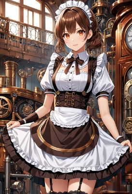 masterpiece, best quality, extremely detailed, anime, girl, skirt, a pretty woman, ahoge, garter belt, maid uniform, brown hair, orange eyes, maid, colorful, steampunk <lora:flat2:0> <lora:hairdetailer:1> ,