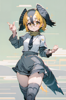masterpiece, best quality, absurdres, ultra detail, extremely detailed, illustration, beautiful, anime style, 1girl, beautiful fingers, beautiful hands, Otaku, Bisyoujo, aritukagera, campo flicker (kemono friends), bird girl, bird tail, glasses, head wings, short hair, blonde hair, black hair, multicolored hair,