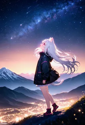 1girl, loli, silver hair, cat ears, long hair, very long hair, pink eyes, looking up, starry sky, profile, smile, night, black jacket, mountain peak, open mouth, cinematic lighting, depth of field, full body, cat tail, (tail:-1), masterpiece, best quality, very aesthetic, absurdres