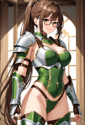 masterpiece, best quality, extremely detailed, anime, , 1girls, solo, brown eyes, green hair, bowlcut hair, yellow hairband, short hair, large breasts, cleavege, standing, smile, blush, black full body suit, green bikiniarmor, shoulder armor, Gauntlet, Garters, highleg string panty, T-back, black pantyhose, <lora:eyecolle_edelweiss_v100:1>