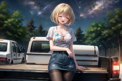(best quarity:1.5), high resolution, (extremely detailed), ultra high res, 8K, masterpiece, (perfect anatomy), (1 girl, beautiful girl), 20 years old, large breast, adult, sexy, (shiny blonde hair, bob cut, flat cap), (brown off chest T-shirt, opened clothes, breasts out:1.8, showing breasts:1.8), (denim skirt, brown sheer pantyhose), (standing, leaning on truck, arms crossed), (decorative truck, shooting star printed side of truck bed:1.4), (yawn, closed eyes, open mouth, palms on mouth), (car parking of