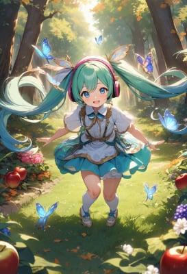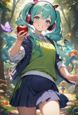 masterpiece, best quality, extremely detailed, anime, girl, skirtmasterpiece, best quality, extremely detailed, anime, girl, skirt,hatsunemiku,VOCALOID,mini skirt,twintail,longhair,blue hair, hair,blue eyes, hair,forest,Enjoy the taste of ,smile,grape,apple,PastelCalla,music,green hair,fairy,my child,fantasy,colorful,park,flower,autumn,butterfly,headphones,animals music troupe