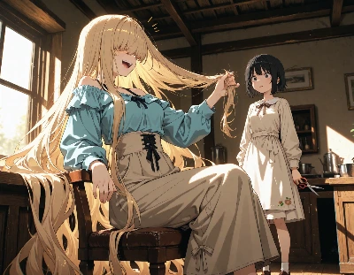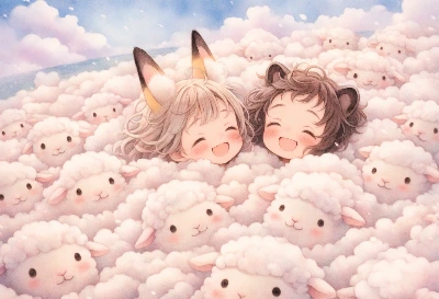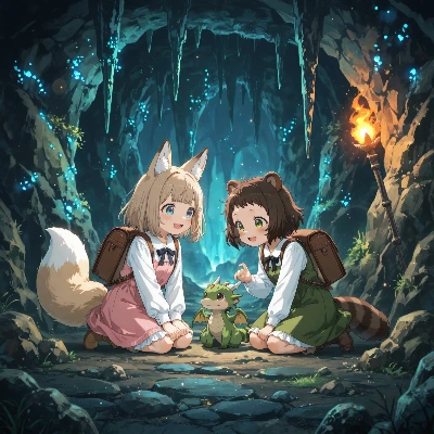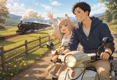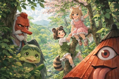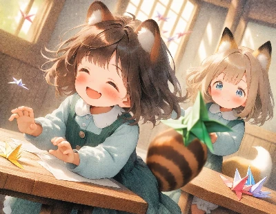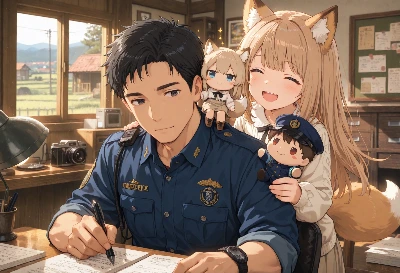 Animated illustration depicting a rural village rich in nature on a mild autumn day. The sky is blue and covered with white clouds, and the landscape is peaceful. In the centre, a young 25-year-old police officer with dark eyes, short black hair and wearing a police uniform without a hat is laughing and talking in a friendly manner with an elderly rural man, who appears to be in his 70s. The policeman is holding a basket of glossy persimmons. Right next to the policeman, a small-breasted, petite, thin girl who looks to be 15 years old with long light brown hair, blue eyes, fox ears and fox tail, is holding a persimmon fruit in her hand with a very honest, cheerful and pretty smile, happily holding it in her hand, her eyes sparkling with excitement and doing a little dance. She is wearing a linen blouse, wool skirt in autumnal colours, apron, knitted socks and wooden shoes. The background is a traditional country house, rice fields, fields, trees beginning to change colour and mountains in the distance. The atmosphere is warm and welcoming, focusing on autumnal tones, soft light and shadows, the texture of the girl's clothing, persimmons and the happy appearance of the male police officer and the girl. Light reflects the gentle autumn sun, casting shadows on characters and objects. Optional elements include villagers in the distance, migrating birds in the sky and ripe vegetables in the fields.