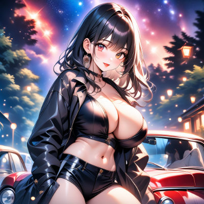 masterpiece, best quality, extremely detailed, anime, girl,black longhair,,red eyes,retro,retro clothes in front of navel,midriff,navel cut out,huge breasts,retro clothes,Retro car,,Retro car{{ai-generated}}},, nature, galaxy,japanese fantasy,, star, night,, (🎇), {⭐}{{{, , best quality, amazing quality, very aesthetic, absurdres , best quality, amazing quality, very aesthetic, absurdres