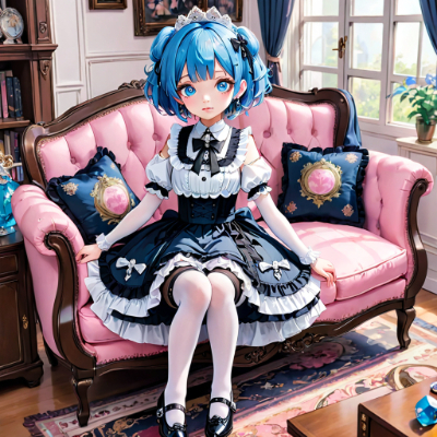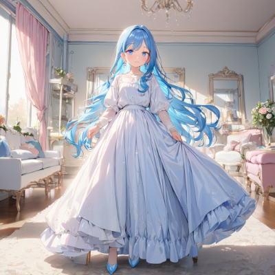 masterpiece,best quality,extremely detailed,anime, girl, skirt,blue hair,blue eyes,princess,light pink color long dress,white stockings,pumps,earrings,colorful,makeup,wink,living room,longhair,my child <lora:hime_style-1.0r8:1> <lora:hairdetailer:1>