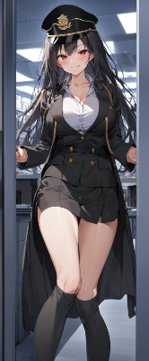 1 woman,masterpiece, best quality, extremely detailed, anime,a beautiful woman,20 years old,black hair,messy hair,red eyes,(black military uniform jacket:1.6),black long pants,white shirt,long sleeves,open shirt,medium big breast,slender,slim and long,tall woman, full body,close chestshirt sticking out,smirk,blush,office,{{{contrapposto}}},cowboy shot,straight-on,night