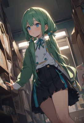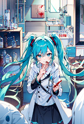 masterpiece, best quality, extremely detailed, anime, girl, skirt初音ミク,vocaloid,mini skirt,twintail,longhair,blue hair,green hair,blue eyes,Twinklingマッドドクター,実験室,血の付いた白衣を着た笑顔の少女。少女の瞳はきらきら輝いている。背後の棚には怪しい薬品や実験道具が並んでいる。,horror,ダークファンタジー
