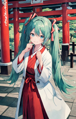 masterpiece, best quality, extremely detailed, anime, girl, masterpiece, best quality, extremely detailed, anime, girl, Photo realistic, illustration of Hatsune Miku, vocaloid, 1girl, twin tails, long hair, blue hair, green hair, blue eyes, shrine maiden. The characters are wearing traditional white coats (white coats) and red hakama. She stands solemnly in the precincts of the shrine and has a quiet and peaceful expression on her face.,twintail,longhair,Japanese style,watercolor,smile