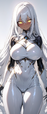 white-background,masterpiece, best quality, extremely detailed, anime,cowboy shot,beauty girl,17 years old,dark-skin,white-hair,very-long-hair,straight-hair,golden-eyes,big-breasts,slim and long,{{{black-bodysuit}}},sadistic-smile,glowing eyes, <lora:eyecolle_achillea_v100:1>