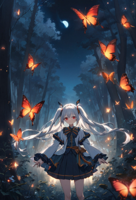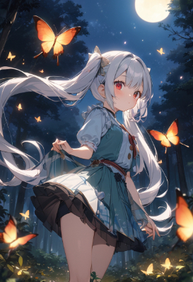 ,fantasy,満月の夜,苔の生えた幻想的な森の中で切り株に座る赤い目で白い肌の女の子。切り株の周りには青白く光るキノコが生えている。青く光る蝶々が舞っている。可愛い笑顔,ファンタジー,butterfly,forest,night,full moon,starry sky