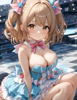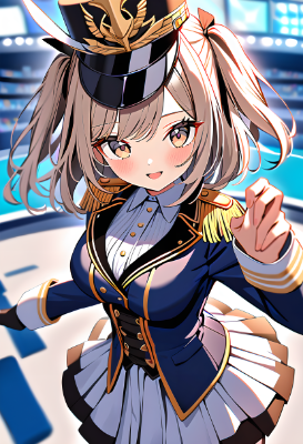 (best quality), (beautiful), (masterpiece), petite, 1girl, upper body above the knees, (marching band costume, navy blue spencer jacket, pleated miniskirt:1.2), light smile, open mouth, light brown hair, medium hair, wave hair, two side up with ribbon, dark brown eyes, large breasts, looking at viewer, confident pose, outdoor stage, from side above