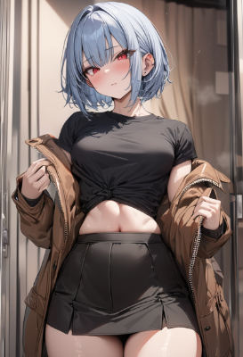 masterpiece,best quality,extremely detailed,modern,1girl,Light blue shorthair,red eyes,Sensual body,big sister,Black T shirt,Black skirt,Brown leather jacket <lora:hyperdetailer_v060.safetensors:1> <lora:saturation:1>
