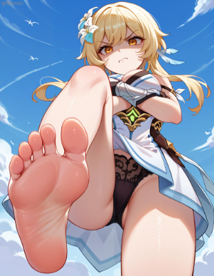 score_9, score_8_up, score_7_up,source_anime, 1girl, (lumine_\genshin_impact\:1.2), looking_down, (shaded_face:1.1), disgust, BREAK, arms_under_breasts, standing, standing_on_one_leg, foot_up, black_panties, BREAK, foot_focus, foot_fetish, foreshortening, from_below, blue_sky,