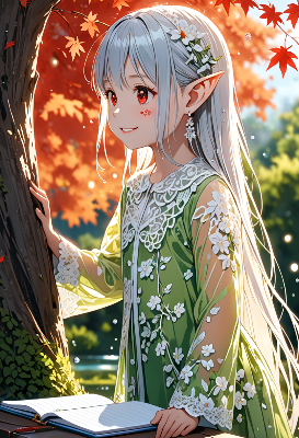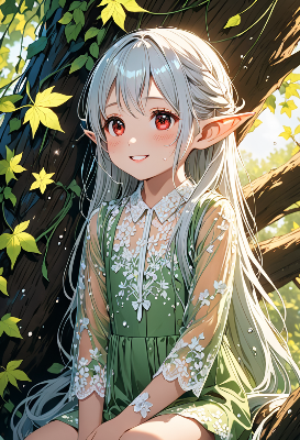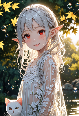 4K,8K,((masterpiece,best quality,Ultra extremely detailed,perfect anatomy,detailed,high resolution,highres,extremely detailed)),eye contact,((close-up eye,from above,flower print,little elf wearing see-through black shoulder-length white leather dress with many flill,see-through silk skirt ,see-through sleeves, see-through white Long silk gloves,wearing glossy silver leather jacket, reflecton light,flying)),looking at viewer, red Eye, Reflections reflect strong highlight in eyes,waving shining long white hair_with curly hair,red Eye,elf ear with big earrings,open_mouth,smile,blush,lipstick,full fresh lips,big hip,small breasts,eye_contact,BREAK,4K,large halation,many maple leaves,maple tree,birds,clouds,dark clouds,flushing lightning,wind,cloud sea,sunrise,birds,<lora:hairdetailer:1> <lora:make25d_type1_v100:1>,