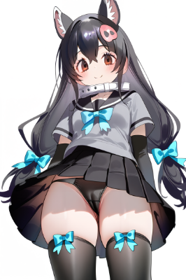 collar, white collar, large collar, blue bow, bow, black sailor collar, grey shirt, shirt, collarbone, elbow gloves, gloves, pleated skirt, skirt, thighhighs,<lora:クビワペッカリー:1>,