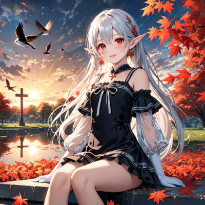 8K,((masterpiece,best quality,Ultra extremely detailed,perfect anatomy,detailed,high-resolution,highres,extremely detailed)),((close-up eye,Flowers print,little child elf wearing glossy jewelry decoration deep-black sailor suit with sparkle reflected light,see-through sleeves, see-through white Long silk gloves,Camisole with ruffles,reflecton light,crosses her legs,sailor cap)),looking at viewer, red Eye, Reflections reflect strong highlight in eyes,waving shining long white hair_with curly half-up,red Eye,elf ear with big earrings,open_mouth:1.5,smile,blush,lipstick,full fresh lips,wet lip,big hip,small breasts,BREAK,4K,plaza in grasses,many maple leaves,maple tree,dark clouds sunrise,birds,<lora:hairdetailer:1> <lora:make25d_type1_v100:1>,,