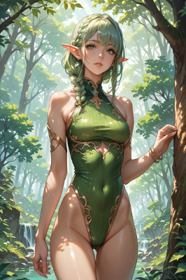 soft braid hair,deep green hair, green eyes, elf, (sunlight filtering through the trees:1.2) ,leotard