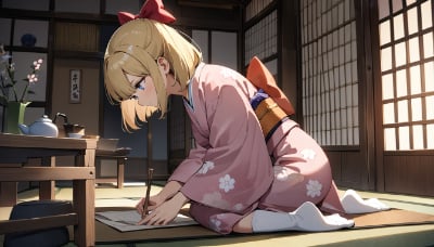 1girl,anime style,japanese room,tatami floor,(traditional atmosphere:1.2),blonde hair,short hair,blue eyes,round eyes,(hair bow:1.4),red bow,concentrated expression,(focused gaze:1.2),traditional japanese kimono,floral pattern kimono,pink obi sash,white tabi socks,kneeling pose,seiza sitting,full body view,holding brush,crafting umbrella,wagasa,bamboo umbrella frame,washi paper,(detailed crafting:1.2),(working hands:1.1),shoji screens,paper sliding doors,wooden beams,(soft natural lighting:1.1),traditional decorations,hanging scrolls,flower arrangement,ikebana,tea room,zabuton cushion,low wooden table,craftsman tools,(delicate work:1.2),afternoon sunlight,(traditional craft scene:1.2),japanese aesthetics,classic interior,paper lantern,bamboo blinds,(zen atmosphere:1.1),slice of life,(masterpiece:1.3),(best quality:1.3),(very aesthetic:1.2),absurdres,