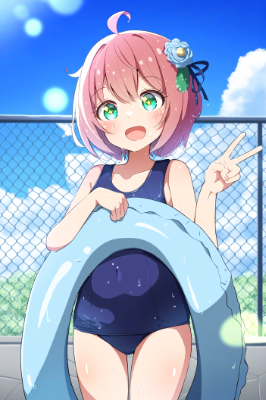 ブルマでてへぺろ…のつもり。 Nstick out tongue(舌出し)で棒切れを持たせる割合が多かったです。 どうもNovelAI先生はstickという単語だけ見てそのまま「棒」と解釈してしまうようで。 GIMPで手持ちの棒を消したり舌出しにするなどして修正した後、0.1~0.2程度の弱めのstrengthで再度i2iして仕上げとしています。