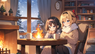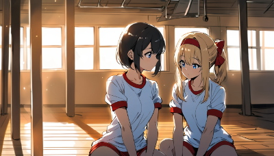 2girls,anime style,sitting,seiza,school gym,indoor,gymnasium,wooden floor,basketball court lines,large windows,natural lighting,sunbeams,dust particles,(blonde hair:1.2),blue eyes,short hair,(hair bow:1.3),red bow,white bloomers,white t-shirt,pe uniform,school uniform,athletic wear,(black hair:1.2),black eyes,hair band,black hairband,small height difference,side by side,waiting pose,relaxed pose,straight back,hands on lap,bare legs,white socks,white indoor shoes,gym equipment in background,wall bars,basketball hoop,stage,curtains,sisterly,comfortable silence,peaceful atmosphere,simple background,clean lines,soft shadows,(masterpiece:1.3),(best quality:1.3),(very aesthetic:1.2),(absurdres:1.2),