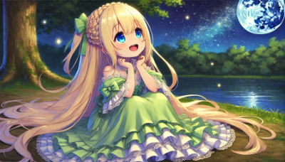 「1人のとても小柄な女性。とても背の低く、とても長く明るい金髪、とても長くまっすぐ流れるようなストレートヘア。身長はとても低く、薄い緑色のロングワンピースにはたっぷりとフリルが幾重にも重なり、薄い緑色のロングワンピースは多くのフリルとレースで豪華に飾られている。ロングスカートの裾やウエスト部分にもフリルとレースの装飾が豪華に施されて、裾まで華やかに広がっている。首元には緑色のリボンをつけている。非常に小柄で可愛く、非常に低い背であり、顔を赤くして笑顔を浮かべていている。非常に長く明るい金髪のストレートヘアが広がっている。青い目。時刻は夜。湖畔に立って星空を見上げる姿を後ろから見た絵。とても背が低い。とても小柄な姿で可愛い。全体がアニメ風に描かれ、非常に詳細な描写。アスペクト比は縦長」の絵を描いて