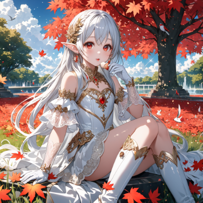 8K,((masterpiece,best quality,Ultra extremely detailed,perfect anatomy,detailed,high-resolution,highres,extremely detailed)),((extreme-close-up eye,Flowers print,child elf wearing glossy jewelry decoration red thin-cloth-suit with sparkle reflected light, sitting,wearing white-sox, see-through sleeves,see-through white gloves, see-through white boots,colored_big_star_mark_contact lenses,eating ice_cream )),looking at viewer, red Eyes, Reflections reflect strong highlight in eyes,waving shining long white hair_with curly,red Eye,elf ear with big earrings,opened_mouth:1.5,smile,blush,lipstick,full fresh lips,wet_lip,big hip,small breasts,BREAK,4K,extreme detailed white princess throne,plaza in grasses,many maple leaves,maple tree,dark clouds sunrise,birds,<lora:hairdetailer:1> <lora:make25d_type1_v100:1>,,,