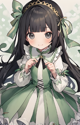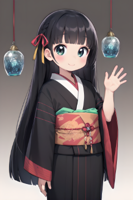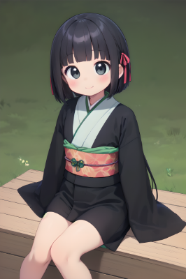 1 girl,(((very longest hair))),black hair, ,straight Hair,hair ribbon,mintgreen stripe,Black Eyes,flat chest,straight Across bangs,princess Cut, Very Long Sideburn,roundry Head,Droping eyes,cute,Meekness,Bob Cut,long back hair,12 years Old,kimono,smile,sitting on a box