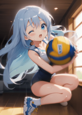 (((masterpiece))), (((best quality))), (((ultra detailed))), (((high-resolution))), ((super fine illustration)), ((Ultimate cutie)),clear looks, improve facial expressions, make facial expressions clear,((((Beautiful spherical shape a blue-yellow volleyball)))), (sweat), steam, dynamic angle, dynamic motion,sense of depth, lighting,(dynamic pose),(indoor), motion blur, full body,BREAK,((((kawashiro nitori)))),(1girl, cute girl, middle breasts), (blue hair, short hair, wavy hair, two side up, blue eyes), green ZUN hat, (light blue shirts),shoes,