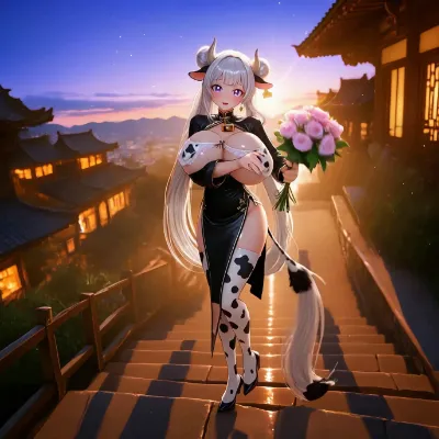 masterpiece, best quality, very aesthetic, highres, ultra-detailed, A scene featuring a white-haired girl wearing a maid-style dress with a large bow, standing in a whimsical world of giant desserts. She is holding a large fork and appears to be leaning towards a giant cherry. The background includes melting ice cream, oversized cookies, pieces of chocolate, mint leaves, and a teddy bear-shaped dessert, creating a dreamy, fantasy-like atmosphere. The scene is bathed in soft light, evoking a magical and surreal feeling, hand,light,HUGE BREASTS,SAGGING BREASTS, beautiful breasts, small areolae, white thighhighs, The girl I like the most