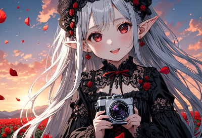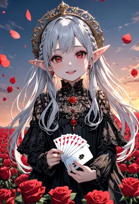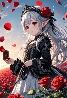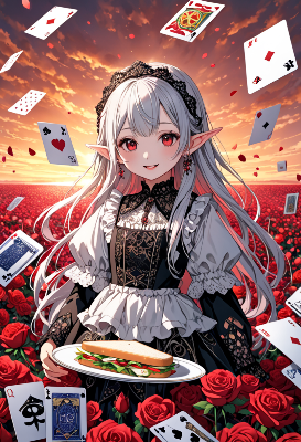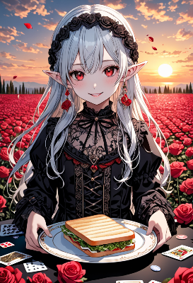 8K,((masterpiece,best quality,Ultra extremely detailed,perfect anatomy,detailed,high-resolution,highres,extremely detailed)),((Close-head,Flowers print,child elf wearing glossy jewelry decoration red striped thin-cloth-suit with sparkle reflected light, wearing white-sox, see-through sleeves,see-through white gloves, see-through white boots)),looking at viewer, red Eyes, Reflections reflect strong highlight in eyes,waving shining long white hair_with curly,elf ear with big earrings,opened_mouth:1.5,smile,blush,lipstick,full fresh lips,wet_lip,big hip,small breasts,holding short_cake,BREAK,4K,((SWEETS PARADISE)),tea-set on round table,many deserts,plaza in grasses,many maple leaves,maple tree,dark clouds sunrise,birds,<lora:hairdetailer:1> <lora:make25d_type1_v100:1>,,