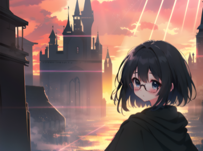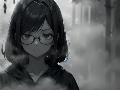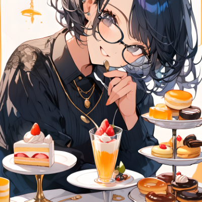 ink drawing, absurdres, highres, ultra detailed, kawaii, cheerful, 1girl, black hair, bob cut, black eyes, (wearing glasses:1.5), holding cutlery, multi tiered stand, cake, tart, pudding, donut, macaron, parfait, parlor,