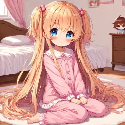 1girl, ((((little female child)))), ((loli)), ((toddler)), ((preschooler)), chibi, two side up, blonde har, very long hair, pink pajamas, pink bobbles, long sleeves, pants, smile, indoors, blue eyes, bedroom, sitting on bed, [[closed mouth]], masterpiece, best quality
