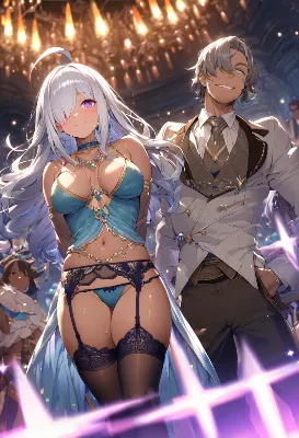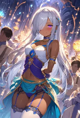 masterpiece, best quality, extremely detailed, anime, , a cool boy, good-looking guy, handsome man, longhair, ahoge, garter belt, silver hair, purple eyes, dancer, fantasy, colorful, magic, different world, panty shot, blushing, happy, smiling, choker, long gloves, thighhighs, dark skin, glistening skin, sweat, arms behind back, hair over one eye, dutch angle, light particles, <lora:flat2:0> <lora:hairdetailer:1> ,,