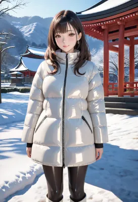 (photorealistic:1.4), (RAW photo), masterpiece, best quality, extremely detailed, lady, elegant, neat and clean, shy, long hair, almond eyes, cold gaze, fearless smile, (shiny off white down coat), closed zipper, ((shiny off white knee high boots)), black pantyhose, park, hill, small shrine temple in the background